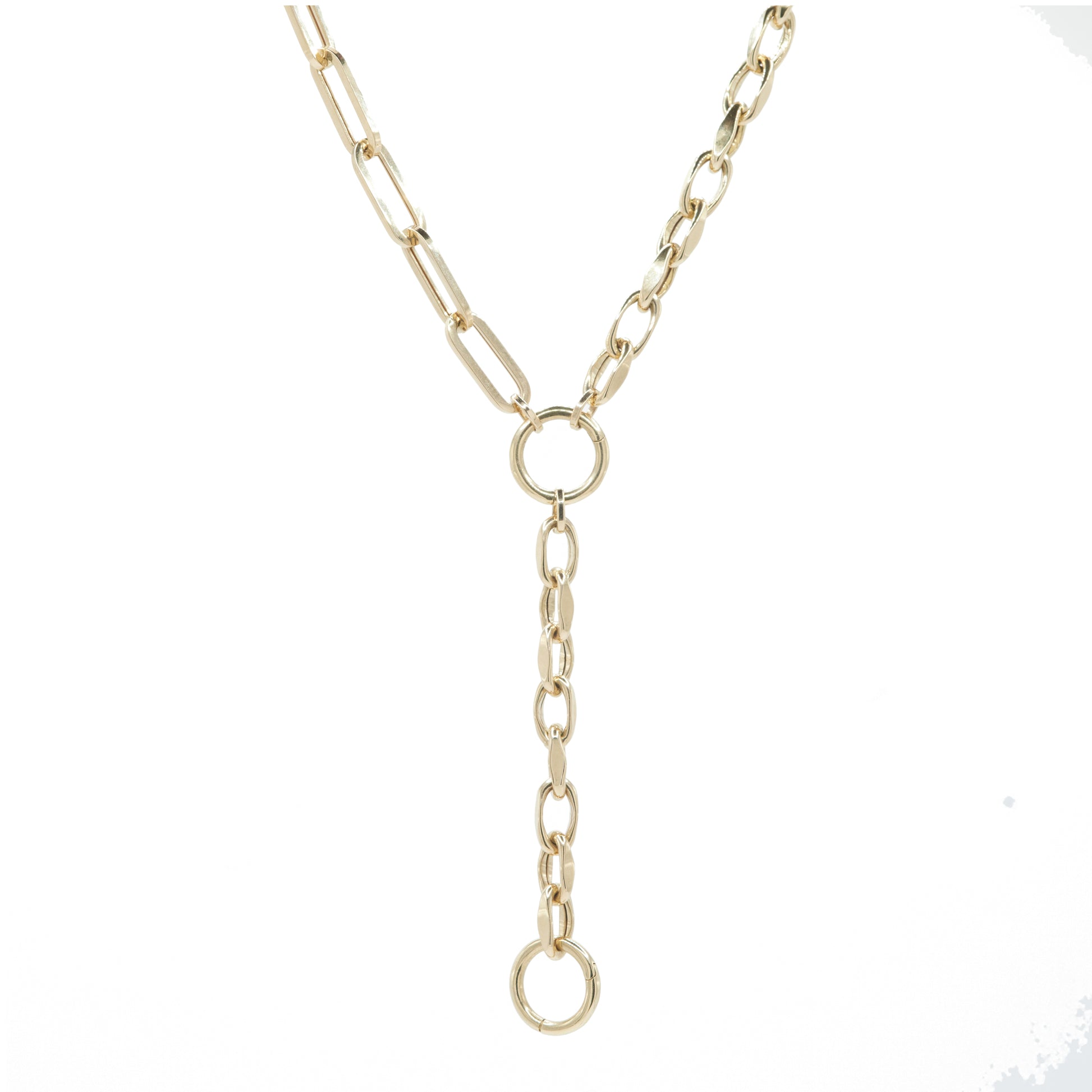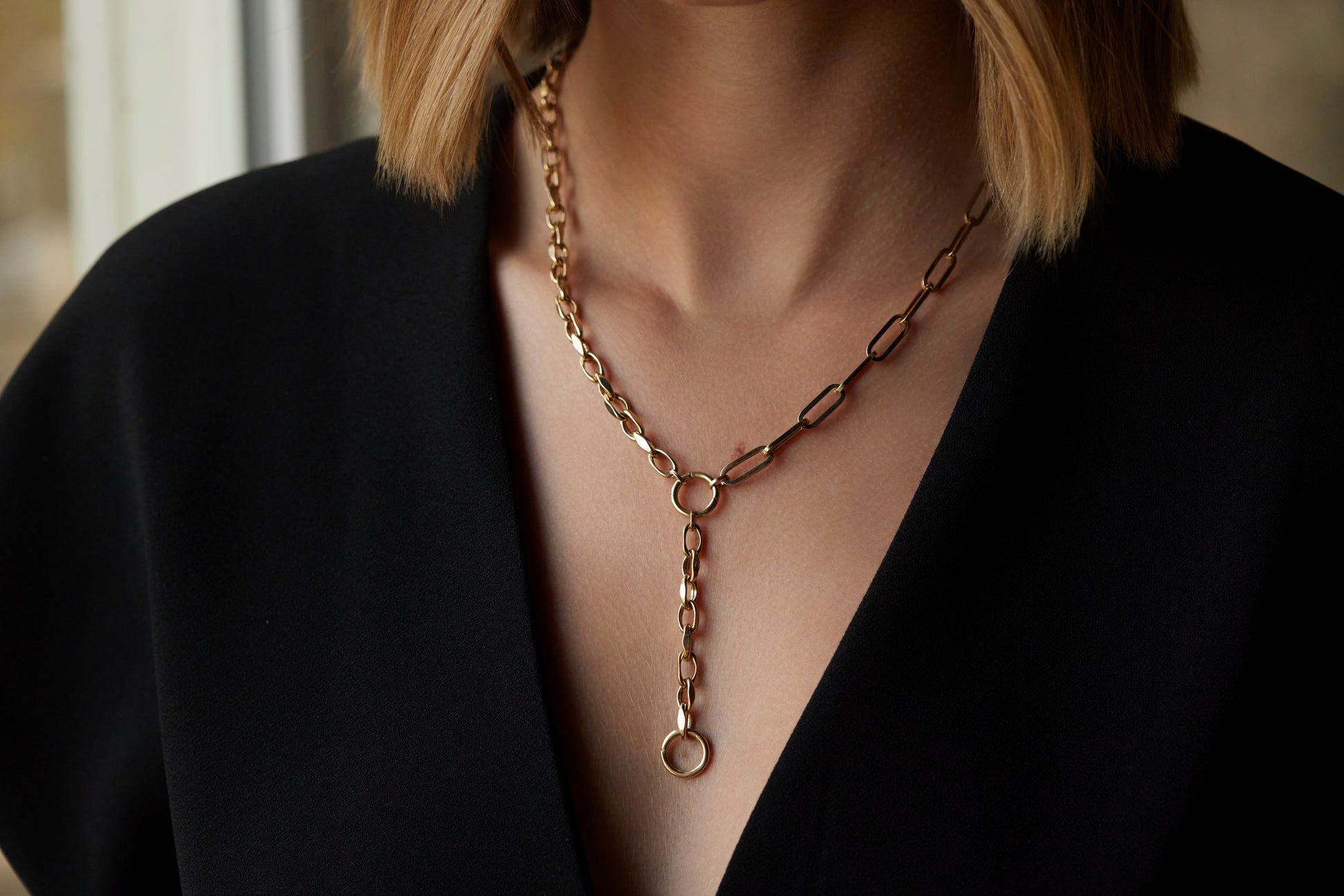 Step up your style with the 14k Gold Lariat Necklace, featuring bold, statement-making links. This striking piece has an eye-catching design with a versatile drop that's perfect for showcasing your favorite charms. Customize it with charms to add a personal touch or keep it classic for a powerful, confident look.